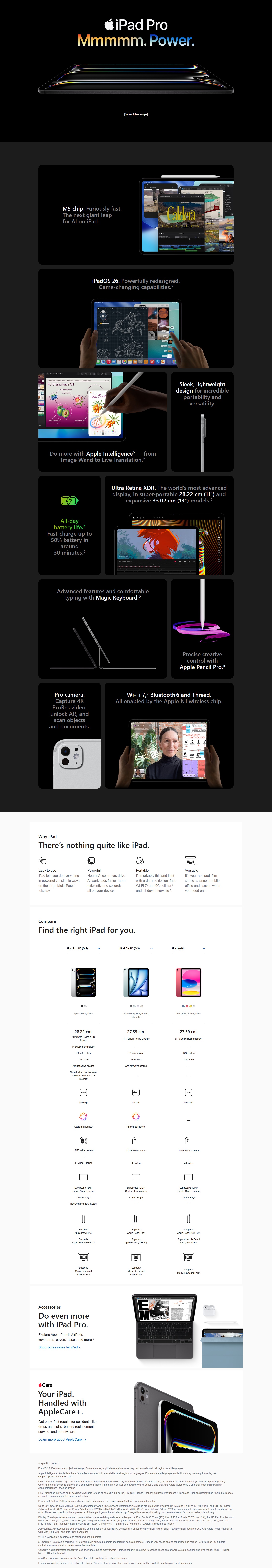 iPad Pro. Built for Apple Intelligence. iPad Pro, powered by the Apple M5 chip, delivers outrageous performance for effortless productivity and advanced AI workflows. With a stunning Ultra Retina XDR display, superfast Wi-Fi 7 and 5G Cellular, Neural Accelerators for AI workloads, and a redesigned iPadOS, there’s no limit to what you can do with iPad Pro.